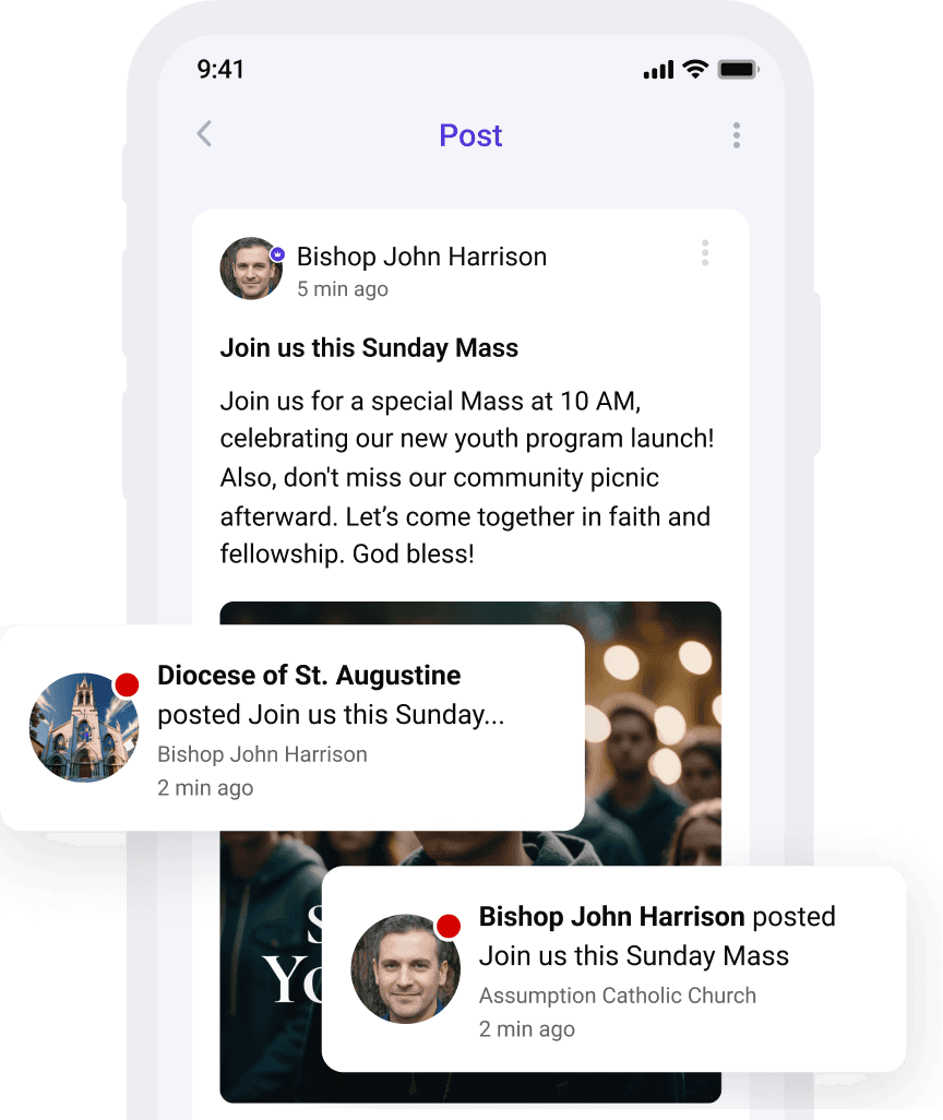 Notifica a toda tu diócesis con un toque. Tabella garantiza una comunicación fiable a través de notificaciones push y correo electrónico, manteniendo a todos actualizados y conectados.